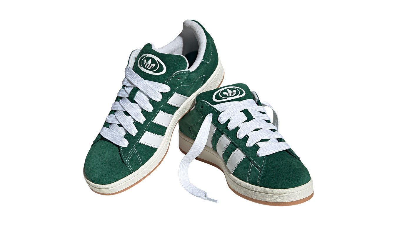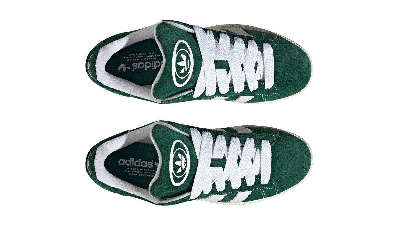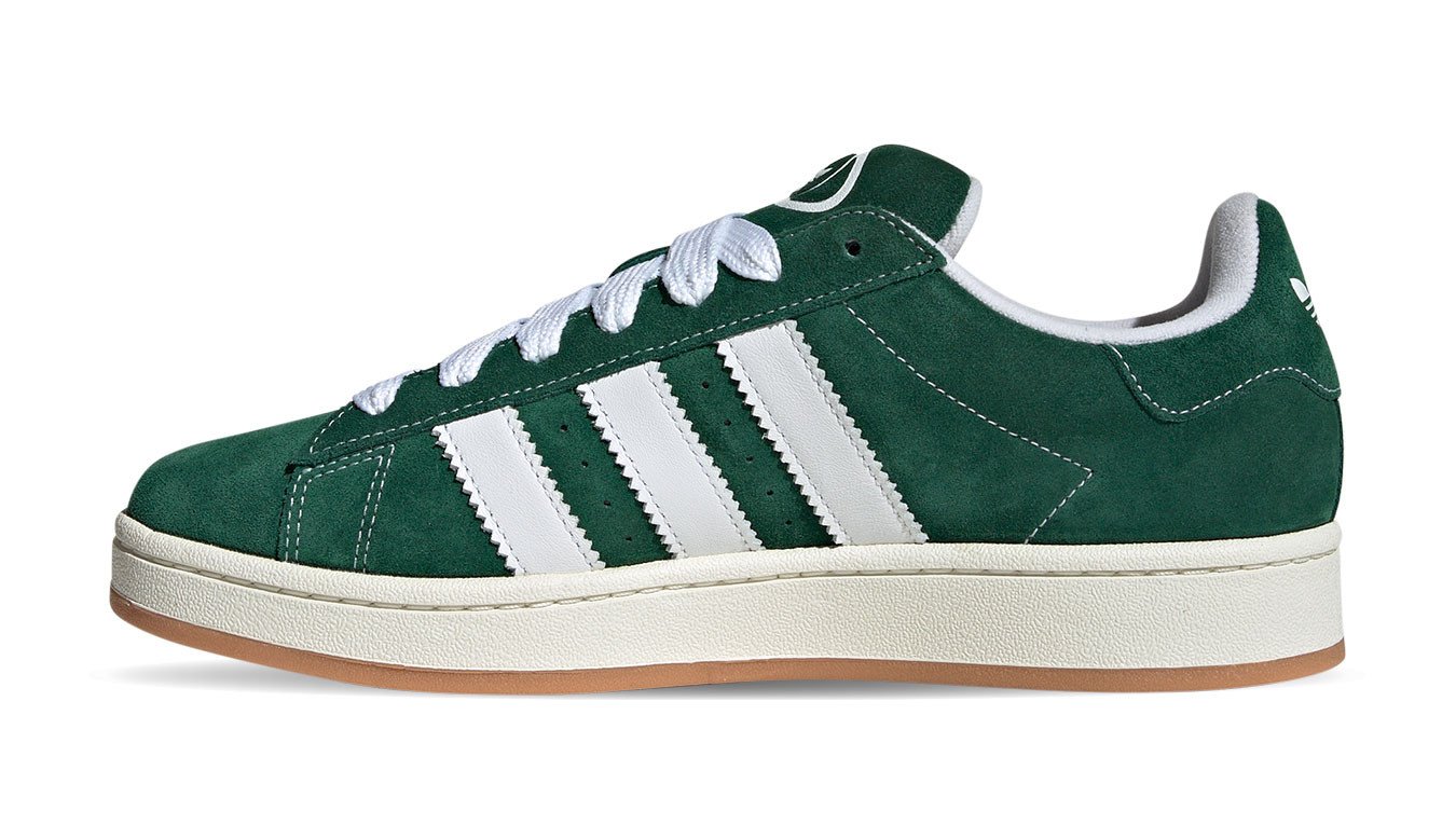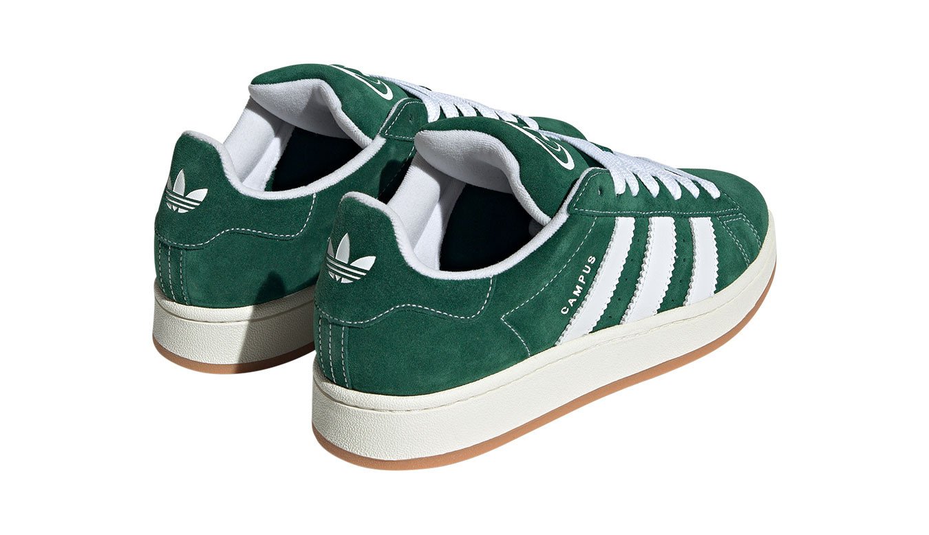 The Dark Green Cloud White adidas Campus 00s has an upper that is constructed from dark green suede. The shoe’s padded collar offers support and comfort. The sneaker’s rubber outsole is durable and provides traction and stability. The perforated ventilation holes on the sides of the upper of the shoe provide breathability. In addition, the shoe has an EVA midsole for padding and support. The shoe features the signature 3-Stripes logo on the lateral sides, “CAMPUS” text on one side, and Trefoil branding on the tongue and heel.