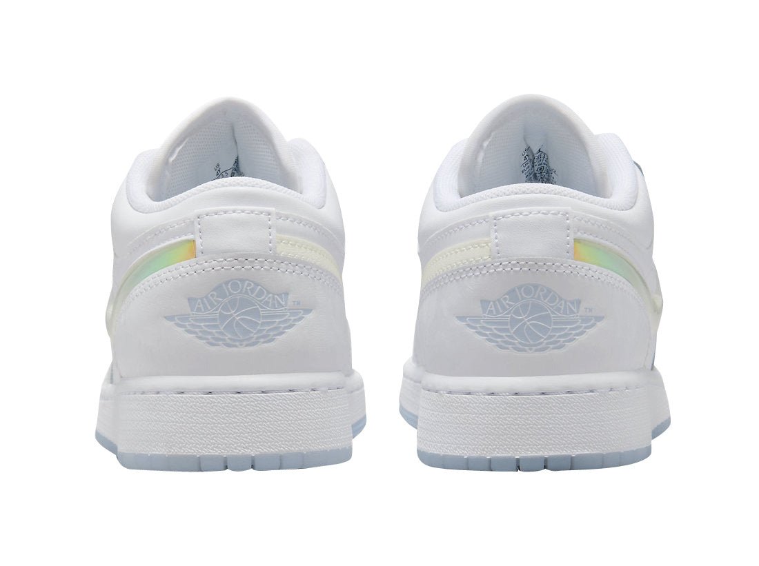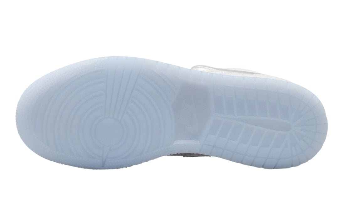 This Air Jordan 1 Low Glitter Swoosh displays a monochrome upper in white leather, all accompanied by a magnificent Swooshbright. A logo Wings is embroidered on the heel while an Icy outsole is finalizing everything.