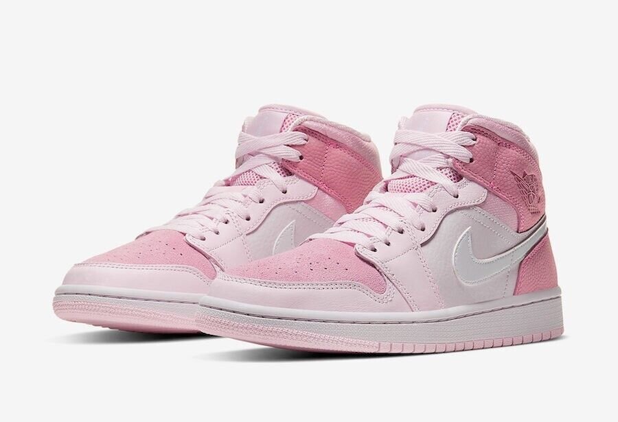 The Jordan 1 Mid Digital Pink (W) features the Nike winged and Jumpman logos printed on the fabric. But instead of making the logos contrast the upper, Nike opted for light, subtle colors that blend in—and nearly disappear—into the rest of the shoe. The rest of the shoe offers light pinks and soft mauves that resemble makeup powder, with a white Nike logo and just a hint of white on the edges. Durable leather, soft suede and pink mesh provide a mix of textures that highlight the different shades of pink.