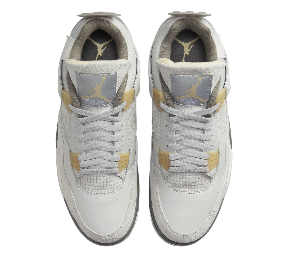 There Air Jordan 4 SE Craft Photon Dust reveal a base in gray leather accompanied by some overlays in Gray Sweden. The usual TPU cage is replaced here by fabric While TPU and brandings are distinguished by their pale yellow shade. Everything is concluded by a dark gray and creamy midsole.