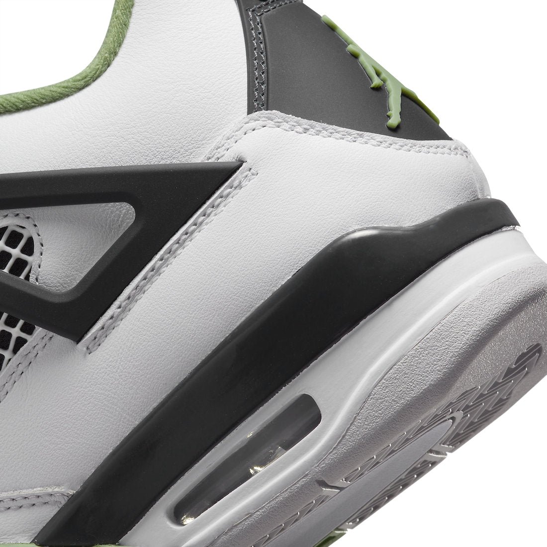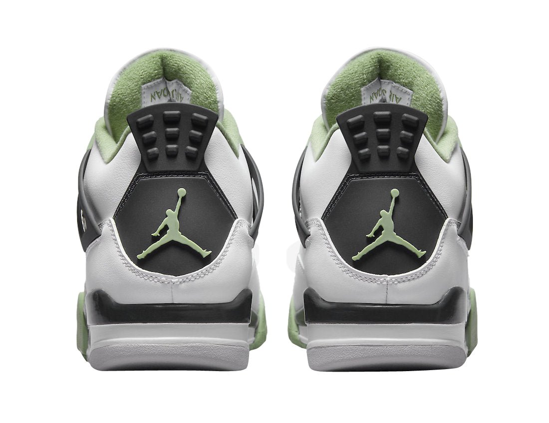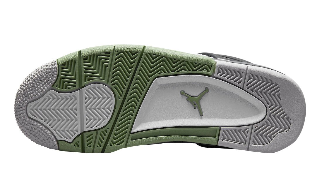 There Air Jordan 4 Seafoam displays a upper in white leather Accompanied by black details such as flaps and heeltab. There TPU cage is present on the side panel in a white shade. A few touches of light green are dotted on the midsole, TPU eyelets, brandings and lining.