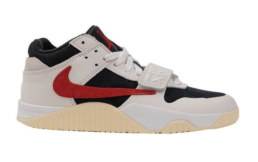 Done in an official color scheme listed as Sail/University Red-Black-Muslin, this new Travis Scott model features a Black mesh construction on the upper which is noted on the side panels and toes along with Sail on the tumbled leather overlays and the suede detailing on the heels. Additional standout details include a midfoot branded strap, red Jumpman branding on the tongues, the Cactus Jack smiley face on the heels, the now iconic reverse Swoosh in a University Red color on the lateral side panel, and “Jack” branding on the Muslin rubber outsoles.